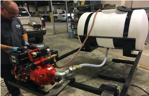 The Davey fire pump was attached to a custom-made steel frame and 150-gallon water tank. Currently the Prado Blaster can be set to different flow rates depending on the treatment needs. Since the Prado Blaster goes through a lot of water, we set the valves up to be able to suck water from the water source being treated.